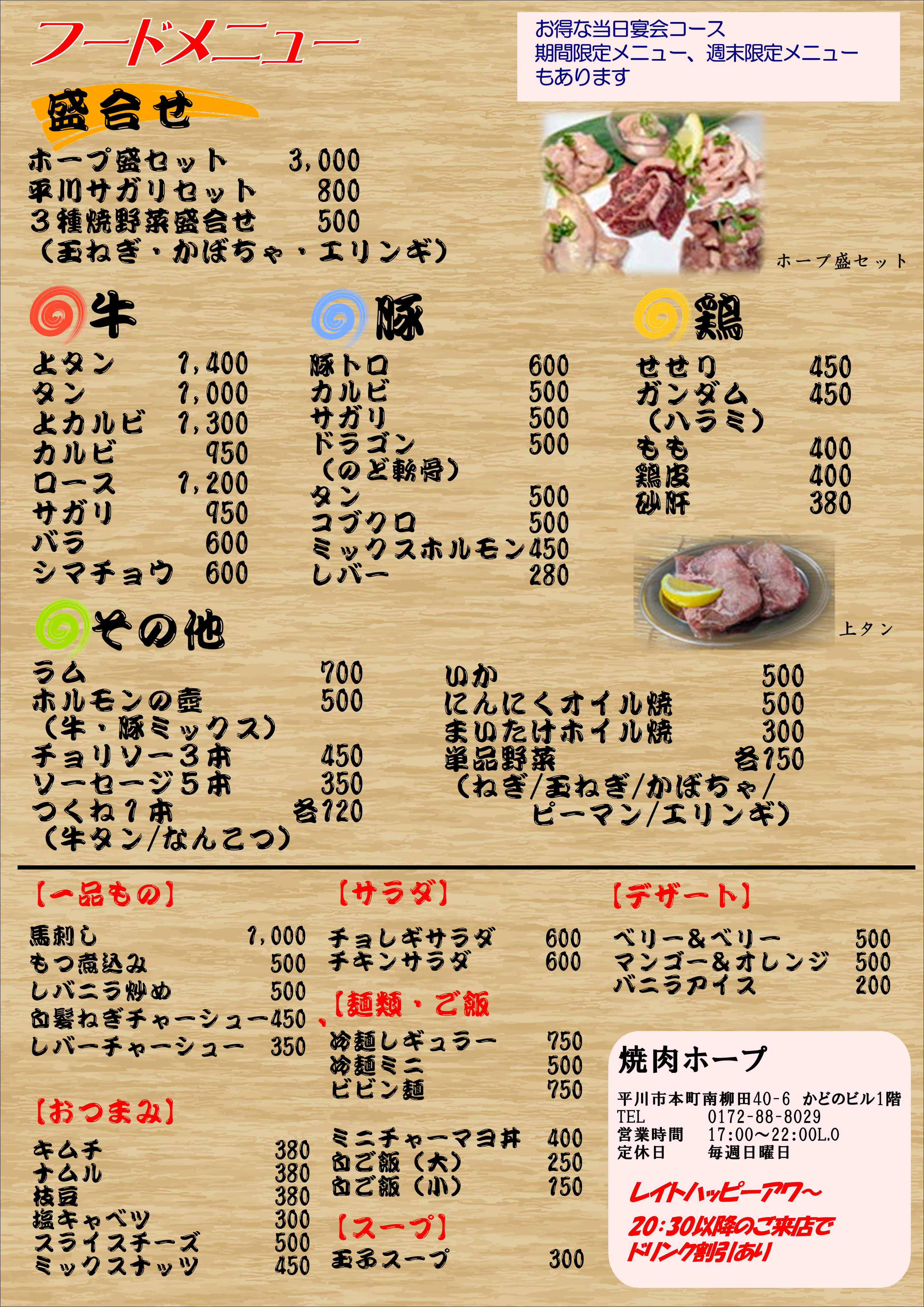 焼肉ホープTEL:0172-88-8029(電話対応時間15:00~)